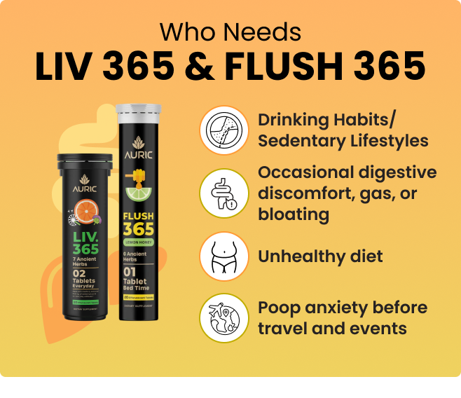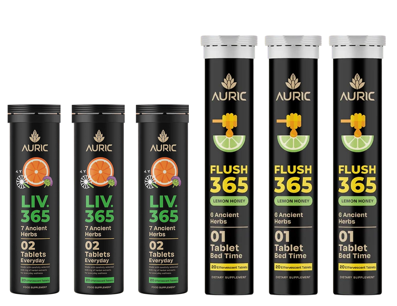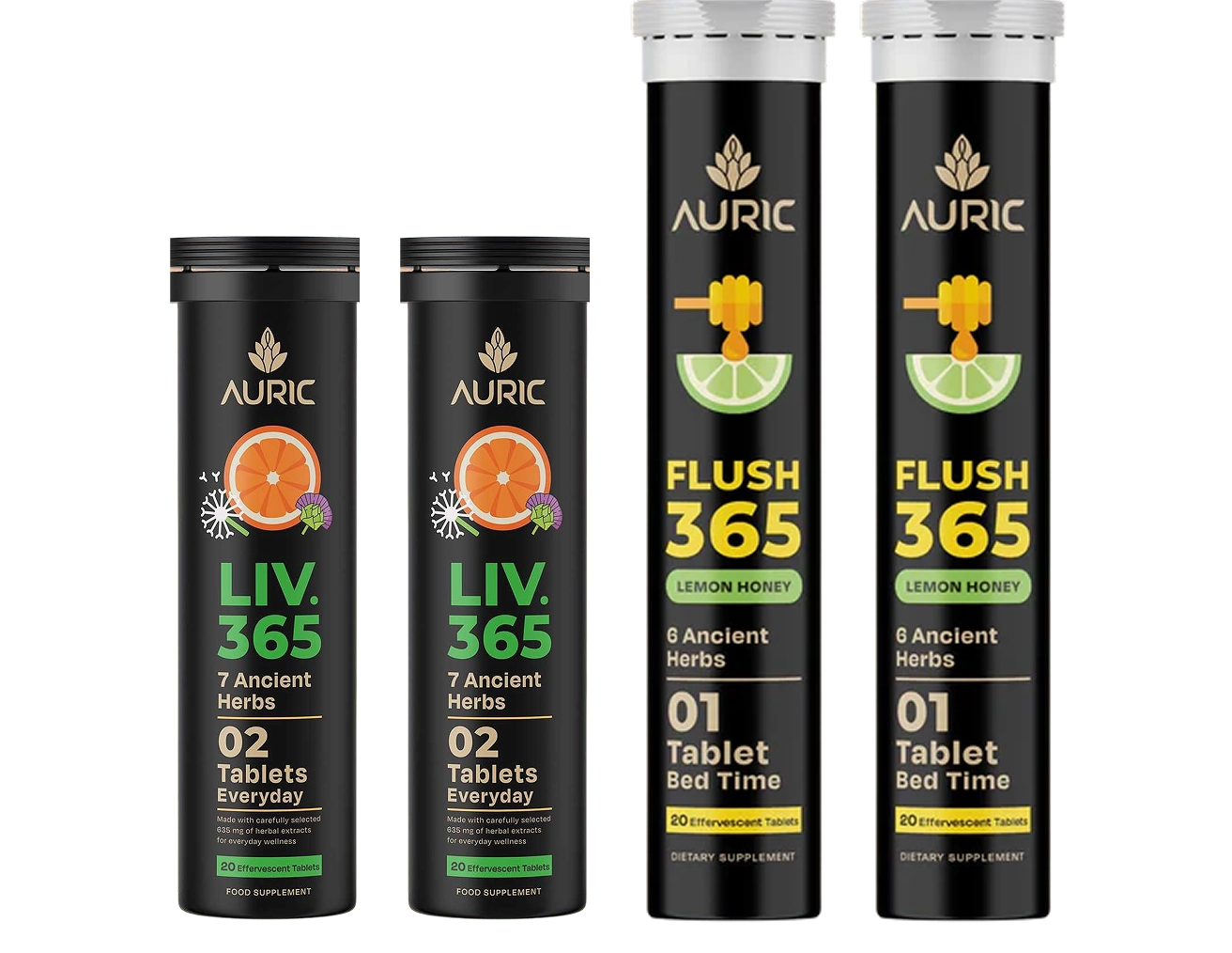 Auric Liv 365 & Flush 365 is a natural Ayurvedic effervescent formula with no known side effects when taken as directed. It’s gentle on the stomach and easy to digest. If you’re on medication, pregnant, or have a medical condition, please consult your doctor first.