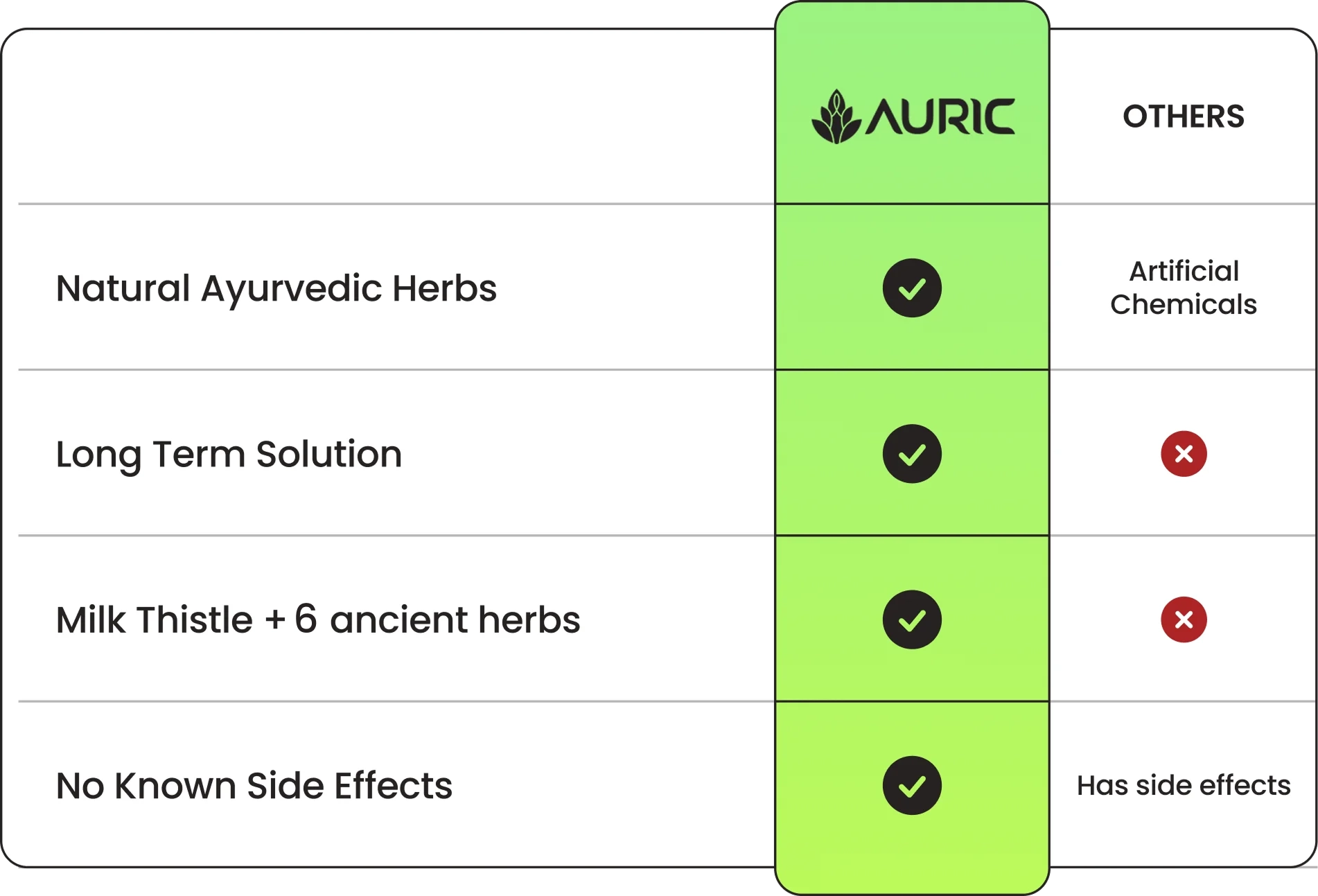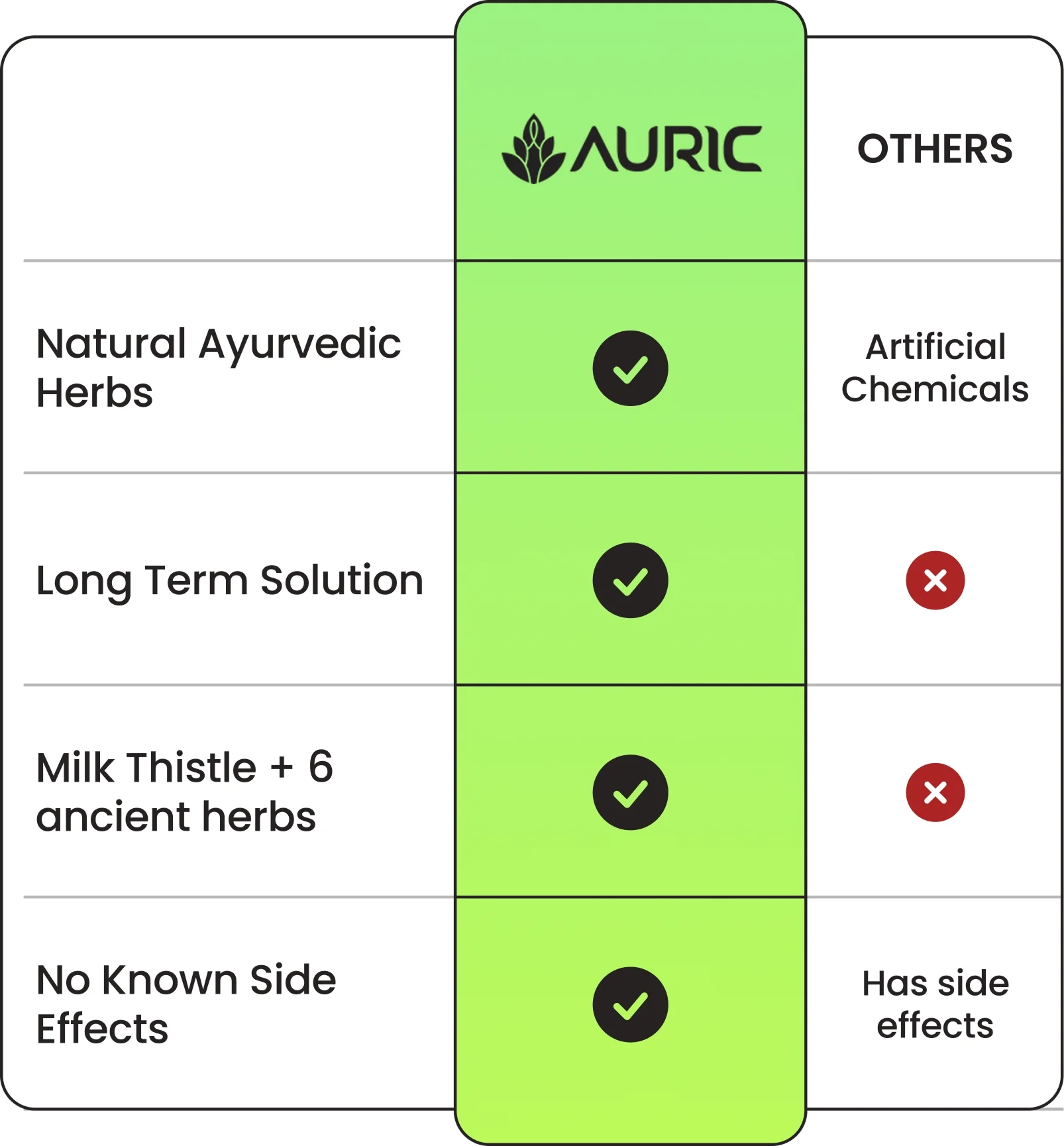 Unlike many herbal supplements that rely on just one or two ingredients, Auric Liv 365 combines a synergistic blend of 7 Ayurvedic herbs including Milk Thistle, Dandelion, Licorice, and Livlonga™ (a combination of Turmeric, Garcinia, and Black Pepper) — formulated to help support normal liver function and overall wellness.*